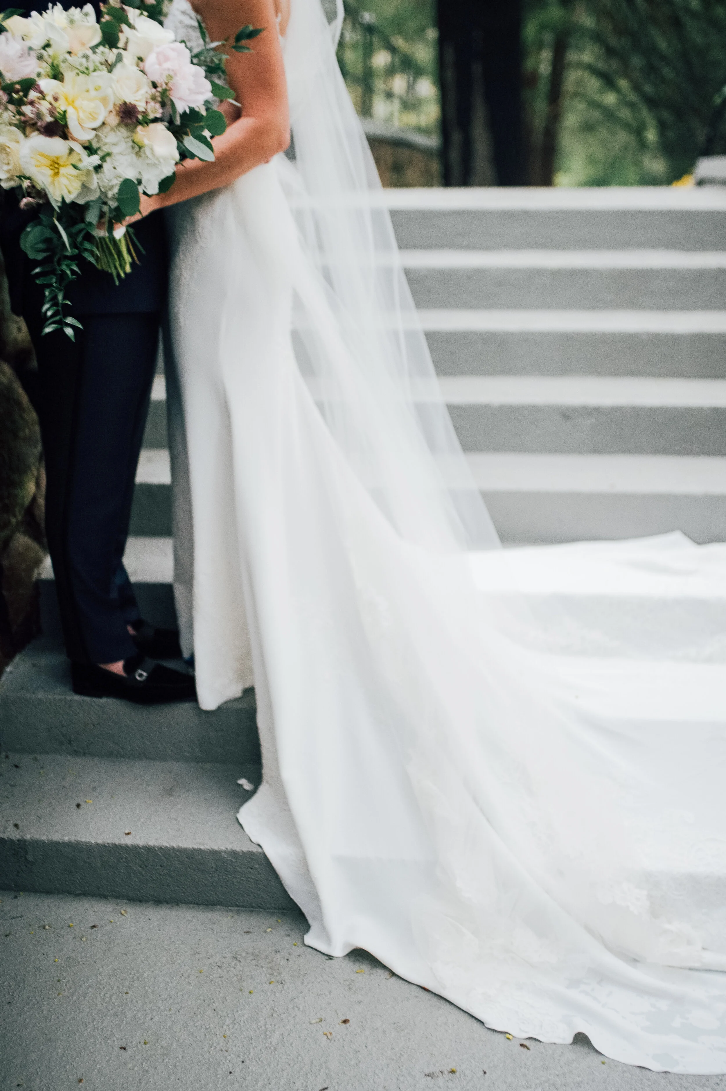 A: For me, finding my dress was actually quite simple. Growing up and living right outside of NYC, I knew I would never have an issue finding my dream dress. It just so happened to be at the very well-known Kleinfeld, which was an amazing experience from beginning to end. Each dress I tried on, I loved more and more until I finally put on "the one", the Vicenta by Pronovias. It was everything I wanted! For my shoes, I went with non other than the Manolo Blahnik Hangisi's, and to go with my engagement ring and band, I wore David Yurman jewelry. Graham decided early on that he wanted to wear a tux - dark blue with black lapels, with Hugo Boss accessories. His shoes were definitely the highlight and turned more heads than mine did... he wore the most amazing black suede Ferragamo loafers. We both take an interest in fashion quite a bit, so we enjoyed dressing up and looking our best!